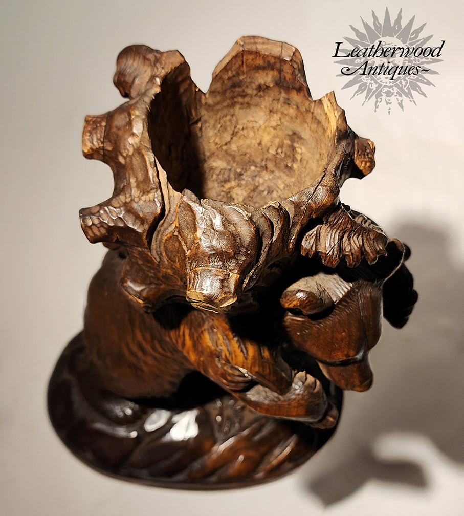 Finely carved Black Forest walnut bear with glass eyes carrying stacks of wood branches fashioned as a pot / bowl on his back. Swiss, Late 19th Century.