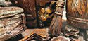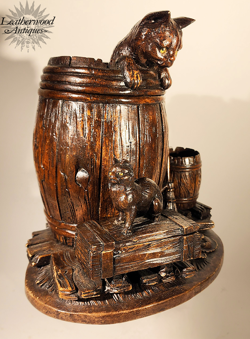 Black Forest Tobacco Box in the shape of barrel with a cat coming out of a hole within the barrel’s base. The barrel opens from the top with a hinge. Swiss c. 1880.