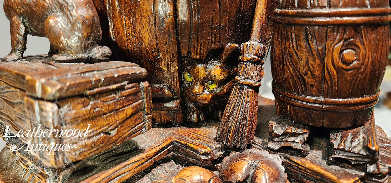 Finely carved special walnut tobacco box featuring a cat peering over the top and another peeking from the underside (not visible in this photo). A broom rests beside the box, and a smaller cat sits on the lid—a hinged match safe. Swiss, Late 19th Century.