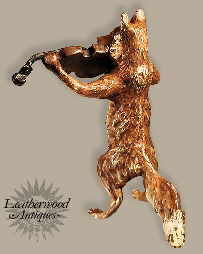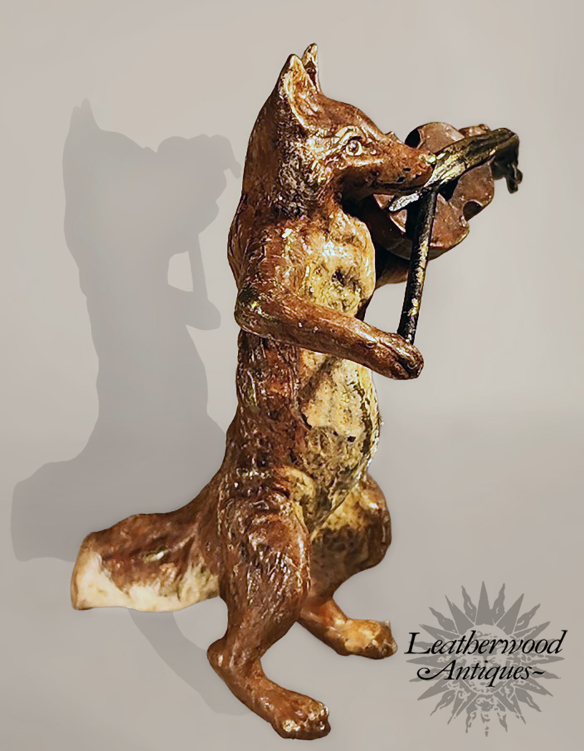 "Brother, can you spare a dime?" Vienna Bronze "begging" fox with arm in a sling and holding a top-hat. c. 1900.
