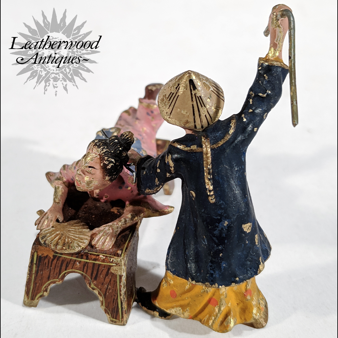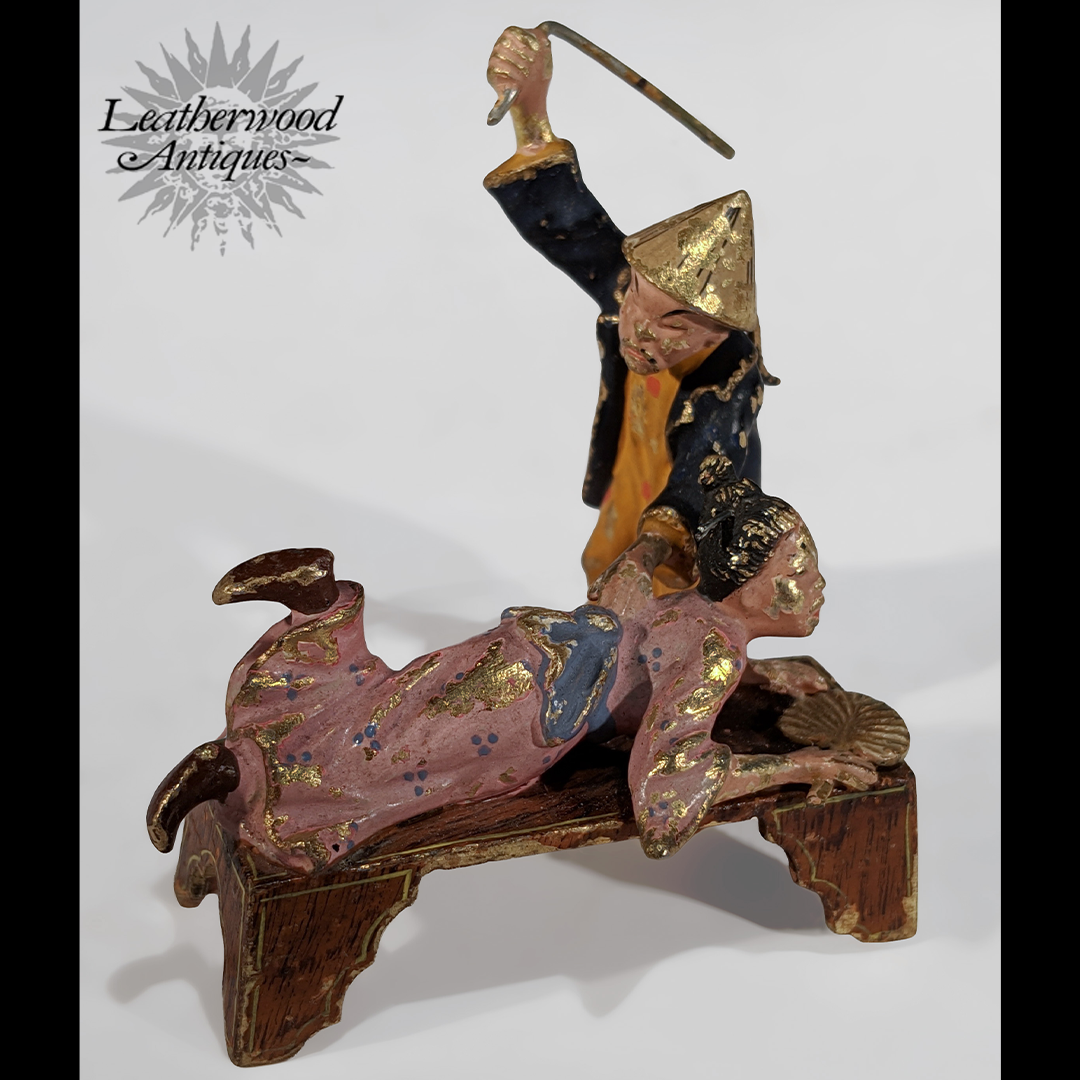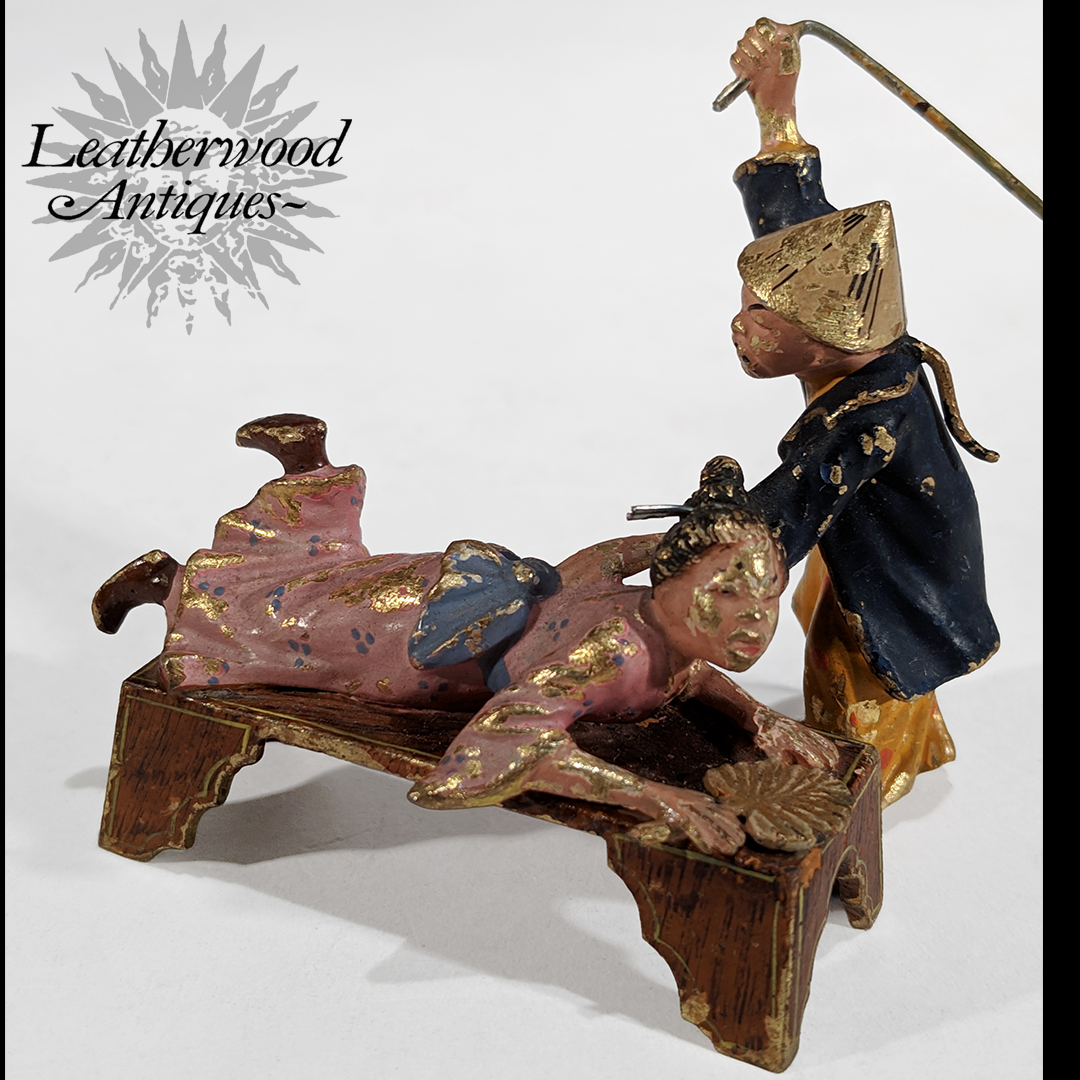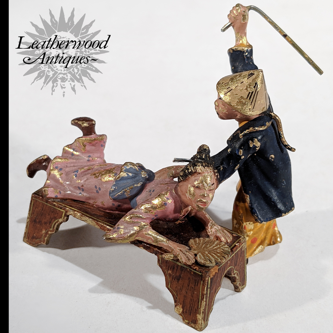 Striking Cold-Painted Vienna Bronze Miniature: "The Punishment." This highly detailed sculpture is typical of the controversial Orientalist bronzes, featuring a figure in a conical hat wielding a whip over a person lying prone on a bench. Early 1900's.