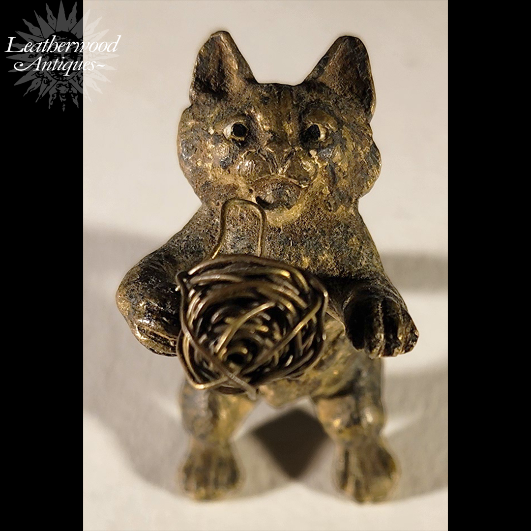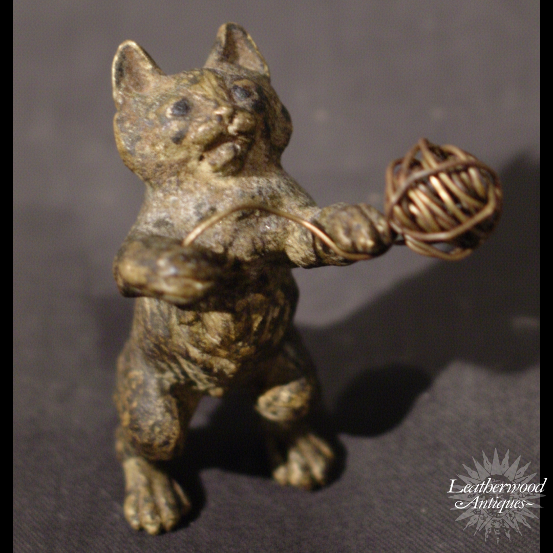Vienna Bronze cat playing with a ball of string. The cat with a cute Victorian cat face and standing on its hind legs. c. 1890.