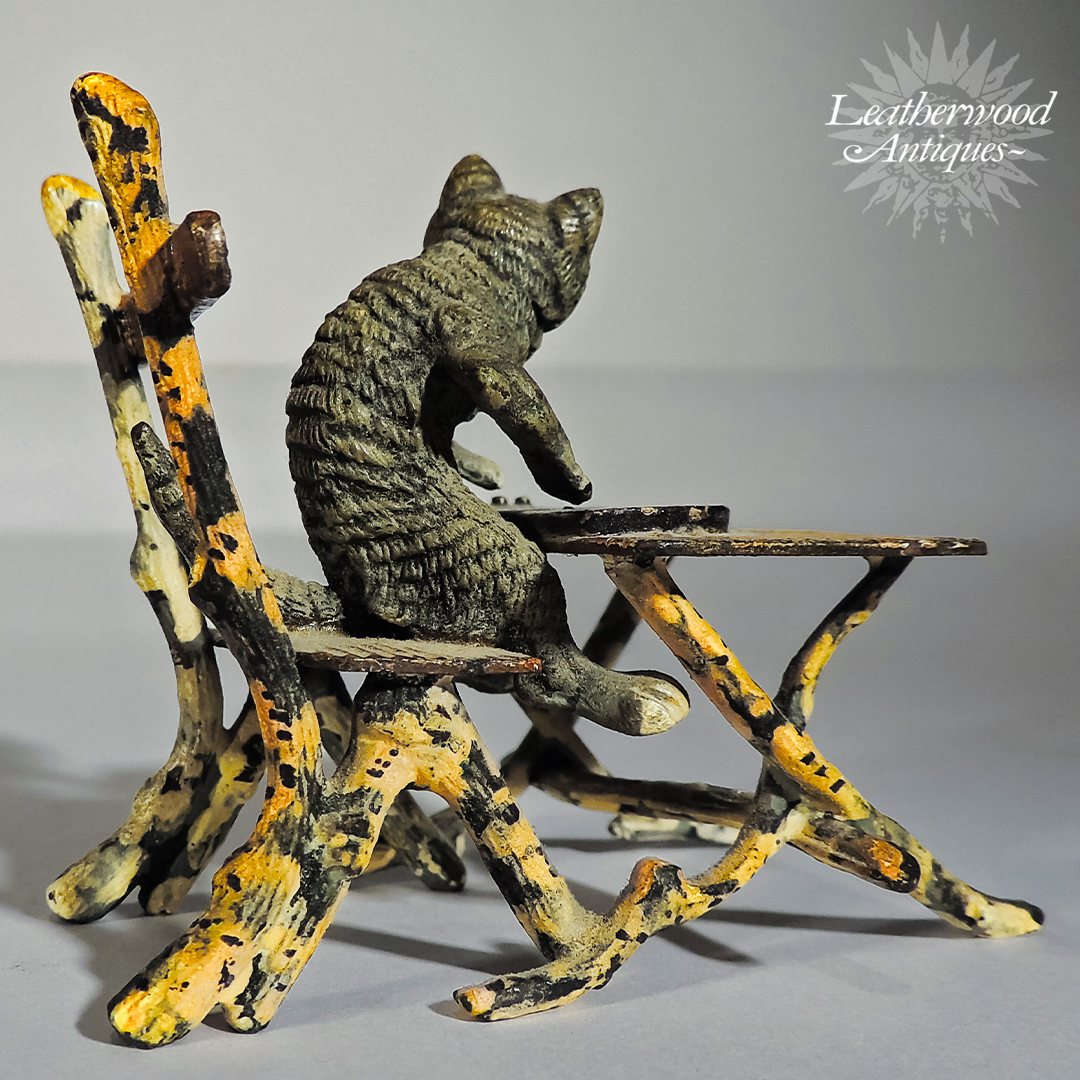 Cold-painted Vienna Bronze cat musician playing on a Zither (string flat instrument) sitting on a rustic chair and table. c. 1900.